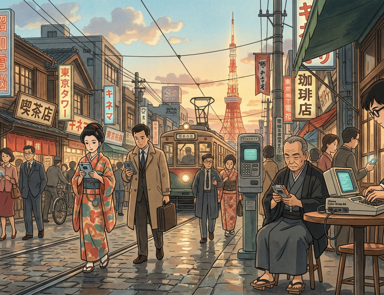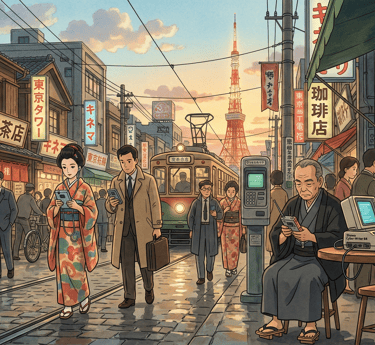 A modern interior with several people interacting with technology, including a digital currency ATM. One person is using a laptop at a table, another is standing at an ATM, and others are using their phones.