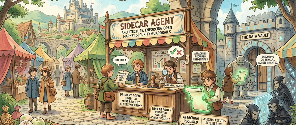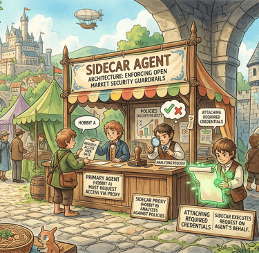 To enforce rigorous security guardrails, a Sidecar Agent Architecture is implemented. In this structural model, the primary agent must request access to data specifically through the sidecar proxy. The sidecar functions as a critical intermediary that receives requests, performs a comprehensive analysis to determine whether to accept or reject them based on established policies, and attaches the requisite credentials to execute the request on the agent's behalf.